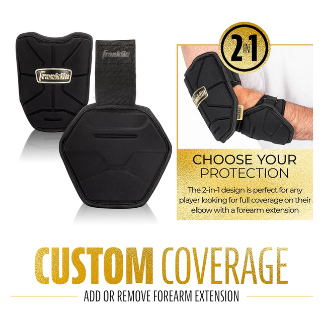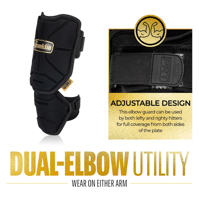 Franklin Sports Adult Elbow Guard (Black/Gold). Protector de codo para bateadores adultos. Ajuste personalizado con velcro. Ideal para proteger el codo a la hora del turno de batear.